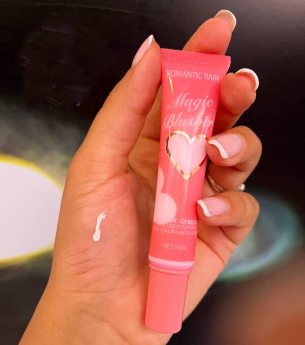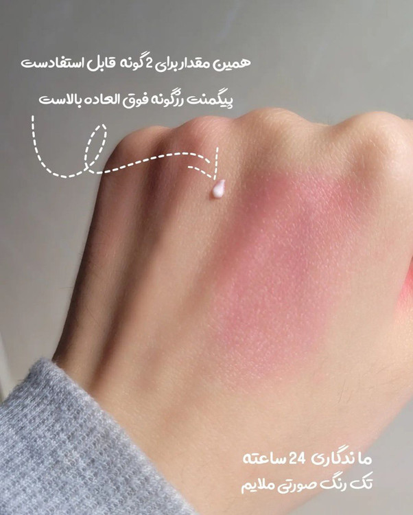 خودش کاملا بی رنگه وقتی میزنید روی پوست کم کم پررنگ میشه و یه رنگ صورتی کاملا نچرال به گونه هاتون میده و صورتیش خیلی ناز و باربی طوره😍